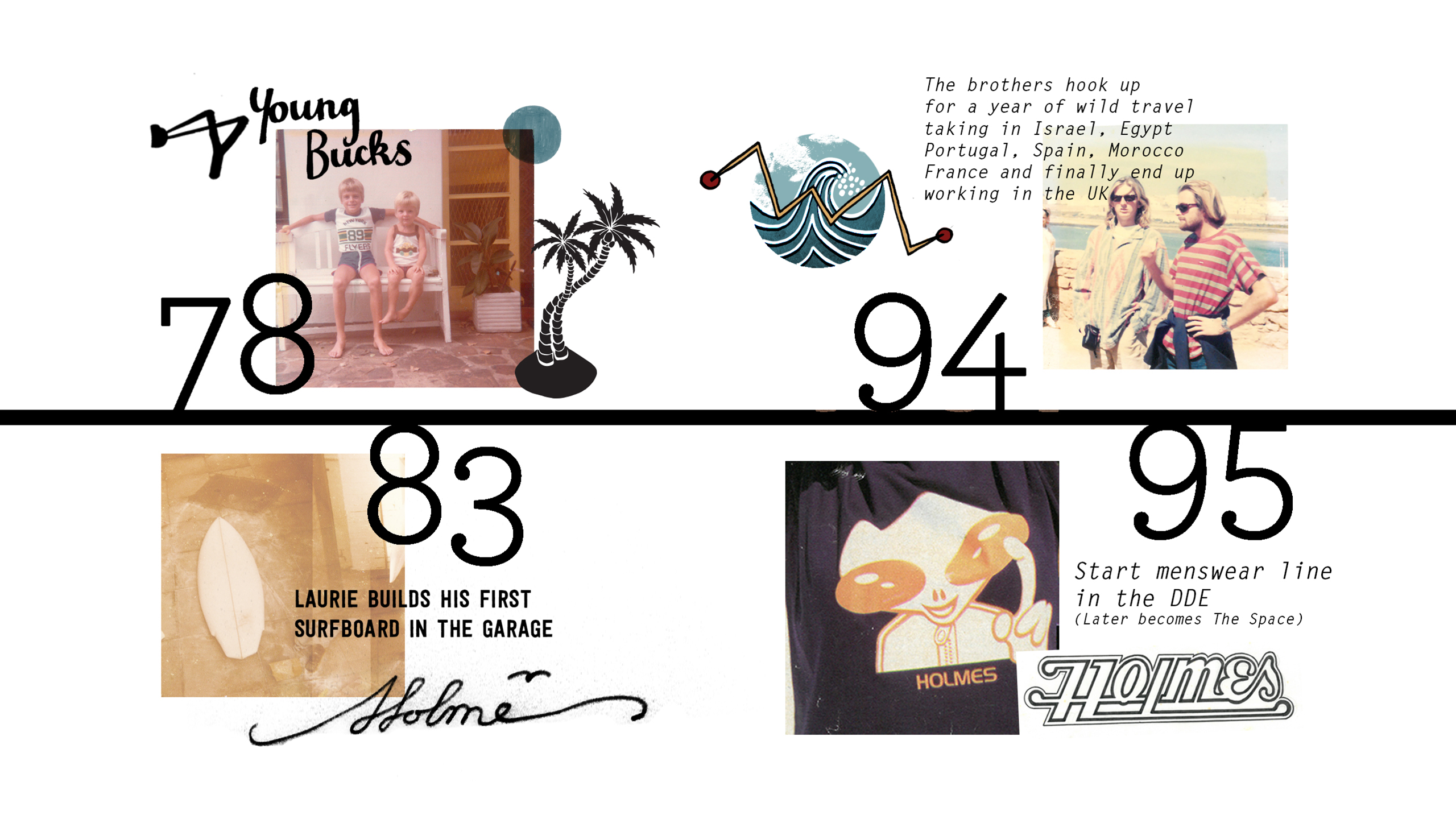 The Holmes story started when Laurie was just 14 and couldn't find anybody to shape the very specific boards he hankered to ride. Eventually, out of sheer frustration he started shaping his own boards in the garage of their house. A Holmes logo was promptly developed for the boards, and from there it was only a short step to putting this newly established IP onto t-shirts and board shorts.