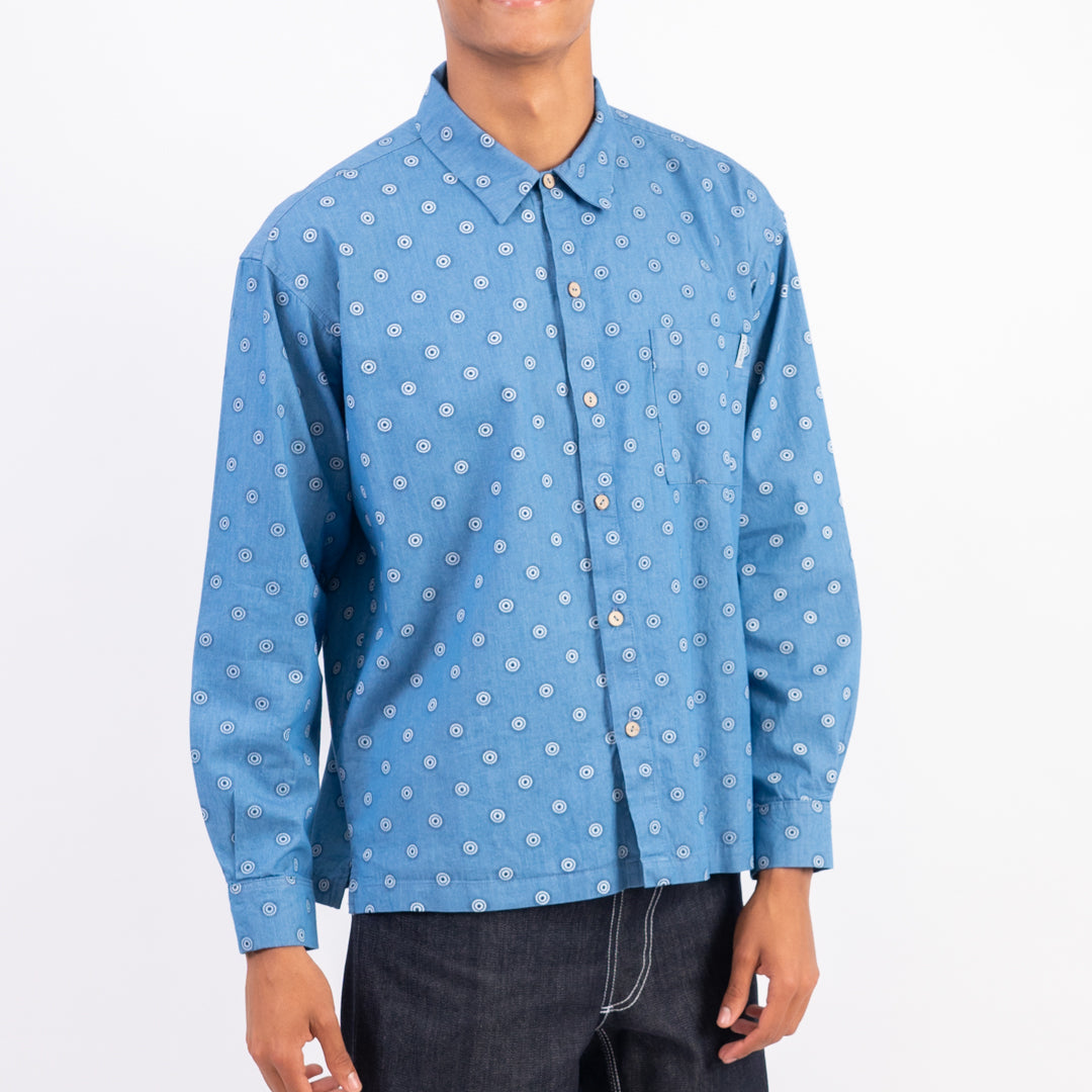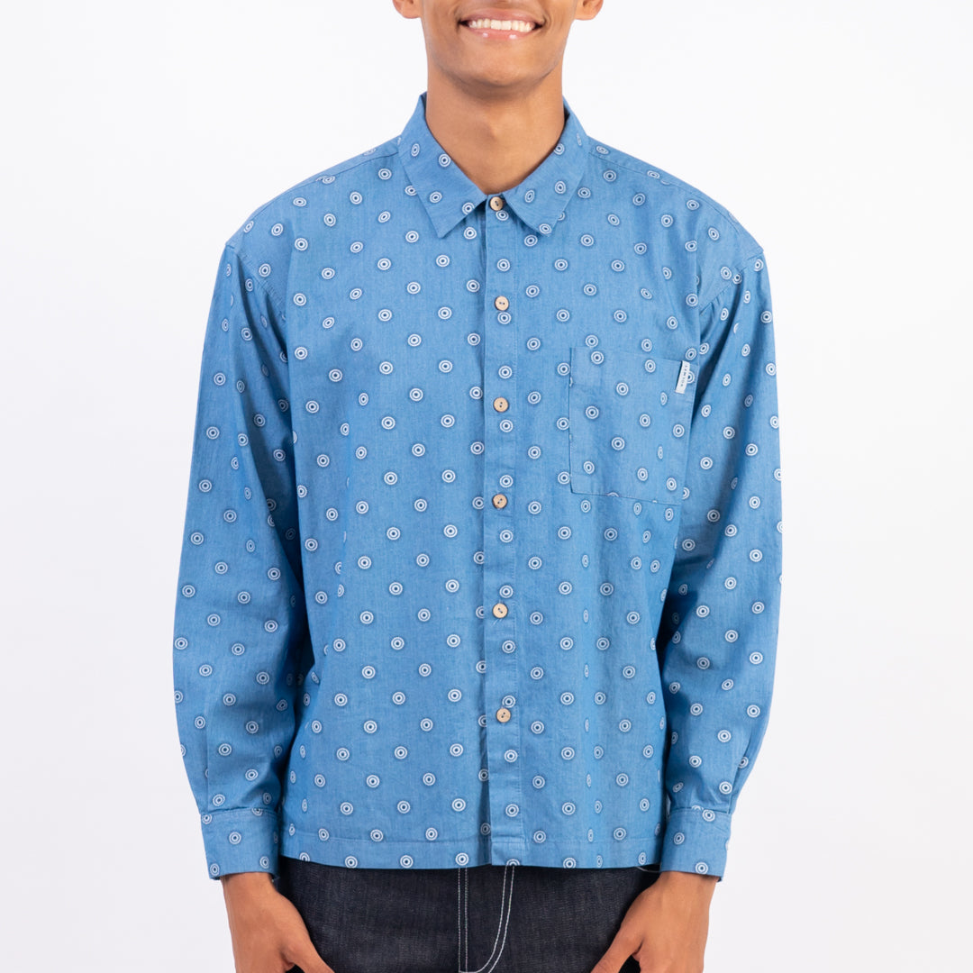 The Circles long sleeve shirt is made from a premium cotton with the unique Holmes circle print. It features a camp collar with a straight bottom hem with side vents.