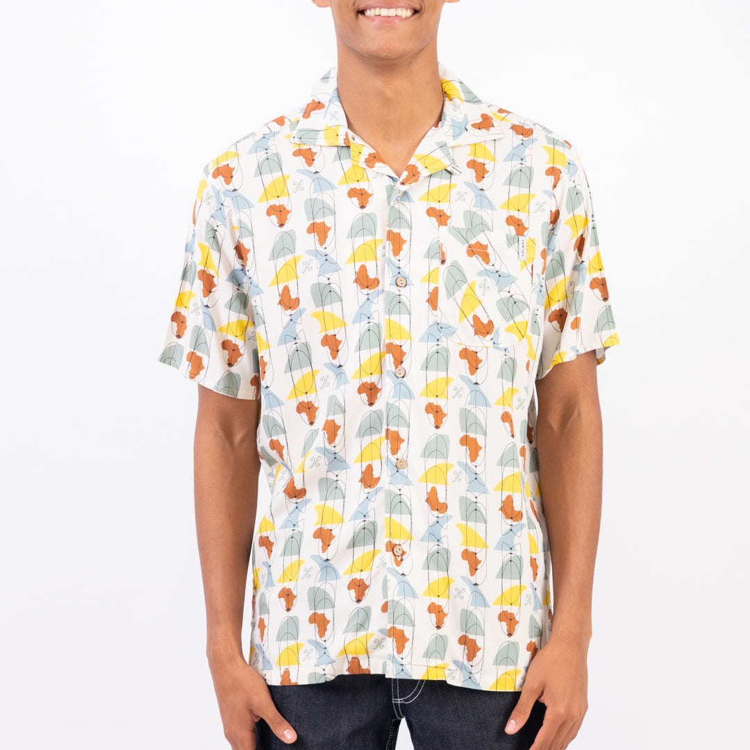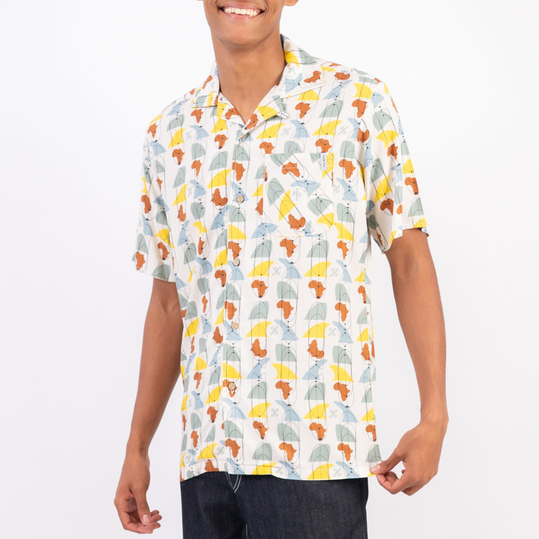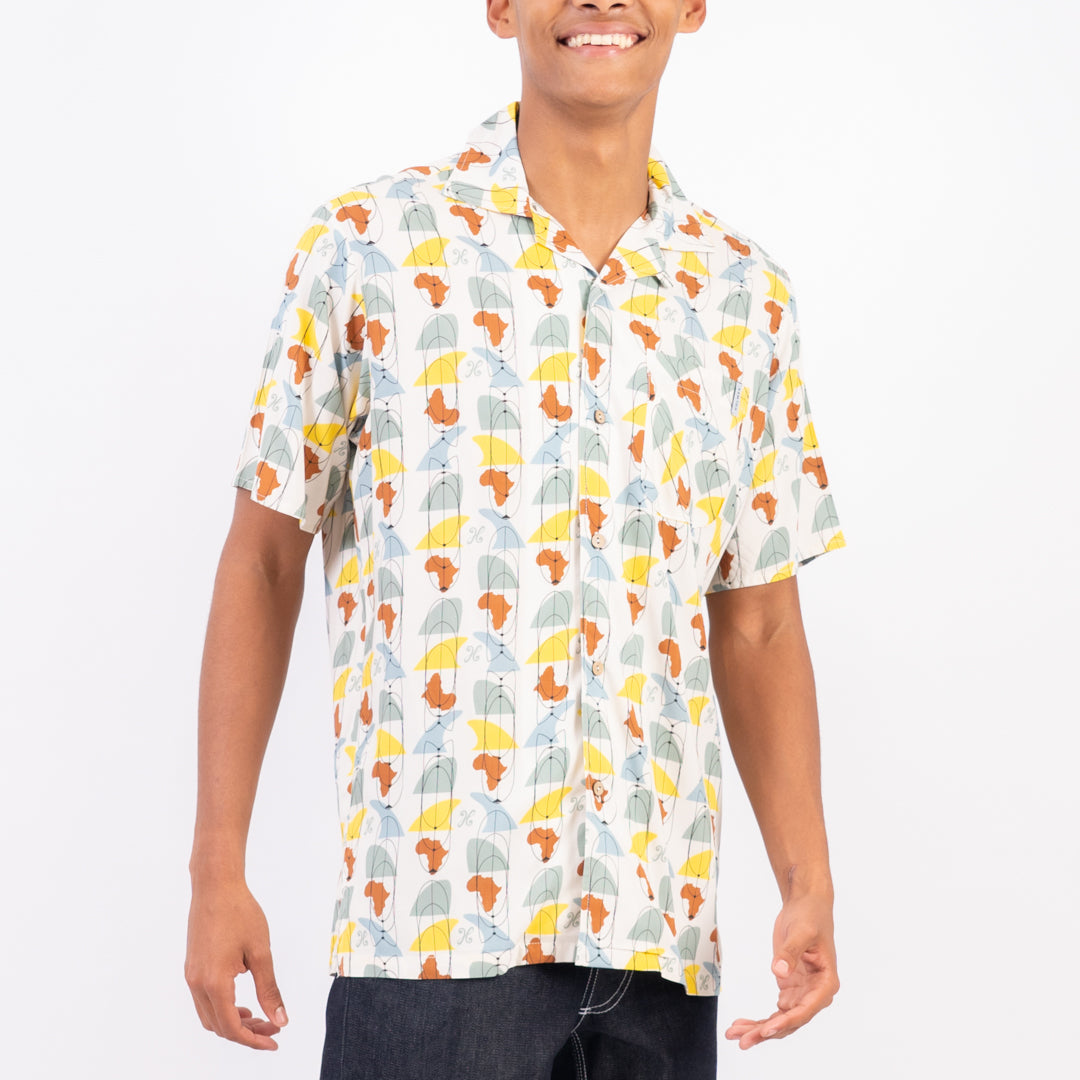 The Fin Hawaiian style shirt made from soft cool viscose is ideal for the beach or dressed up at the club. Featuring an African fin graphic.
