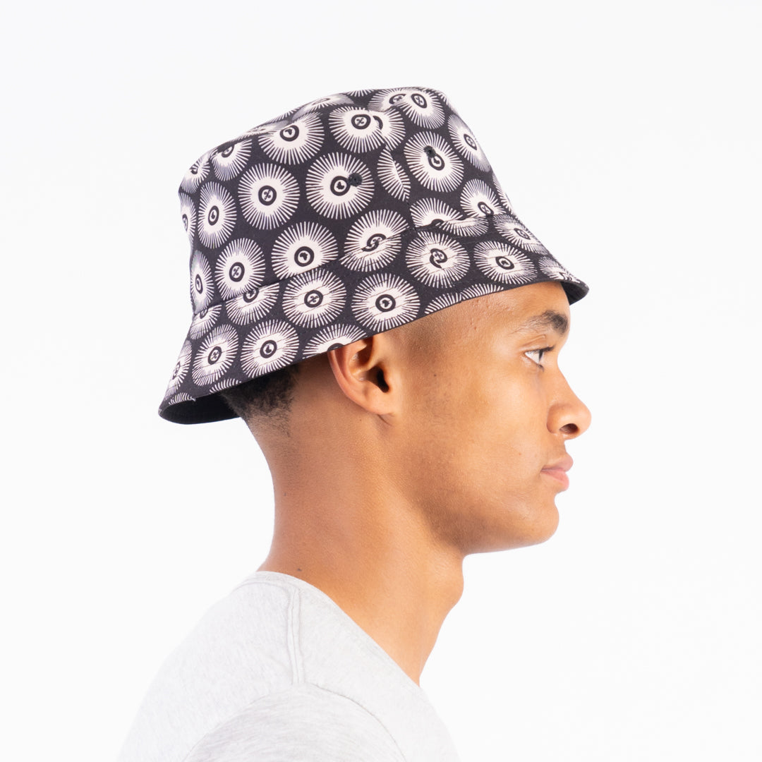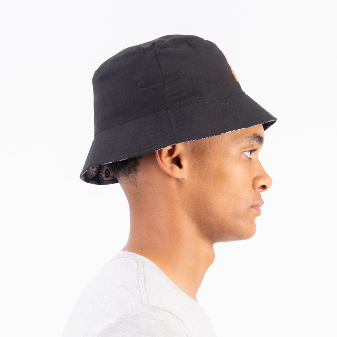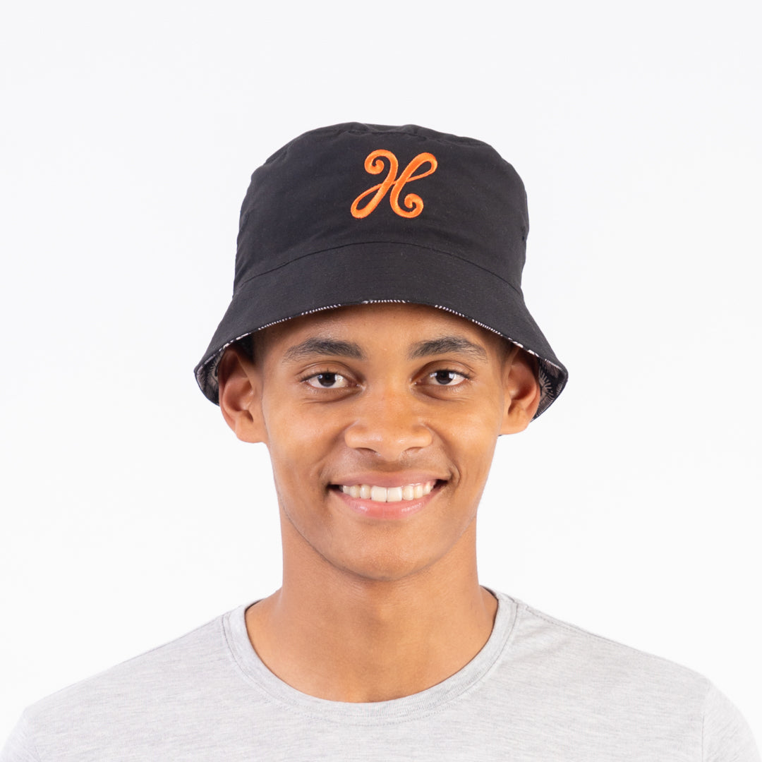 The Dot Swhe Swhe Bucket Hat is super versatile being fully reversible with African inspired print on one side and plain black on the other side with a small H embroidery.