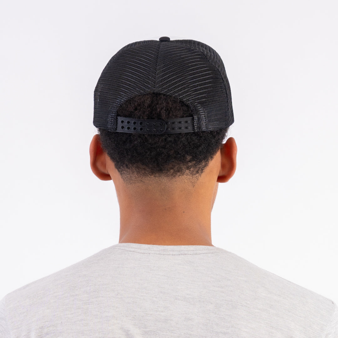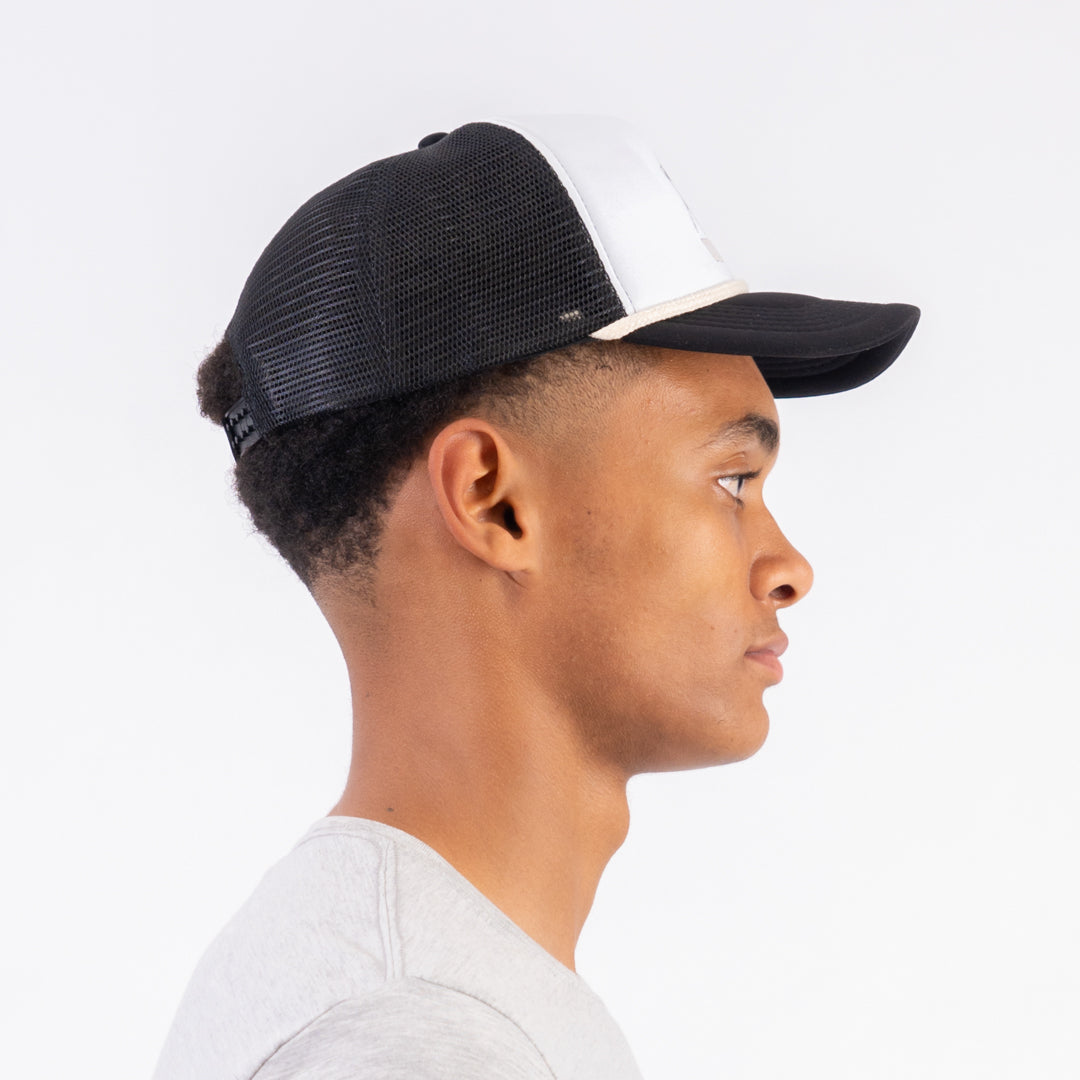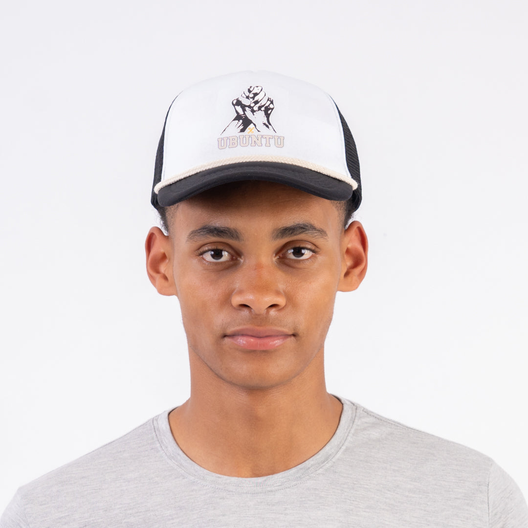 The Ubuntu Cap is a foam front trucker cap with an Ubuntu print featuring two shaking hands with a rope detail on the peak