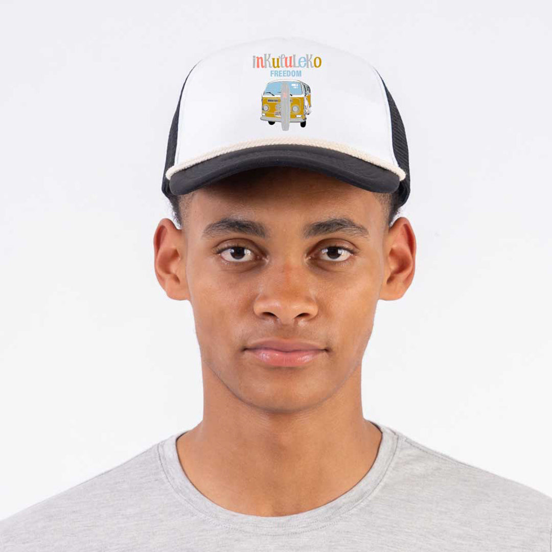 The Inkululeko Curved Peak Cap is a foam front trucker cap with a combi print on the front and a rope detail on the peak.